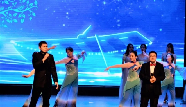 随后,最值得期待的节目——由杨全胜老师、徐少芸老师、熊浩茗同学等表演的歌伴舞《弯弯的月亮》,雄浑的嗓音,婉转的乐音,唯美的画面,婀娜的舞姿,为晚会又添一抹娇美,让在场的台下同学们深深陶醉。老师与员工的嗓音产生共鸣,嗓音又与舞蹈交相辉映,悠扬、优雅、华美,完美诠释了我们计软人对于爱的理解——不是狂轰滥炸的蜜语甜言,而是陪你海枯石烂的字字诺言。
