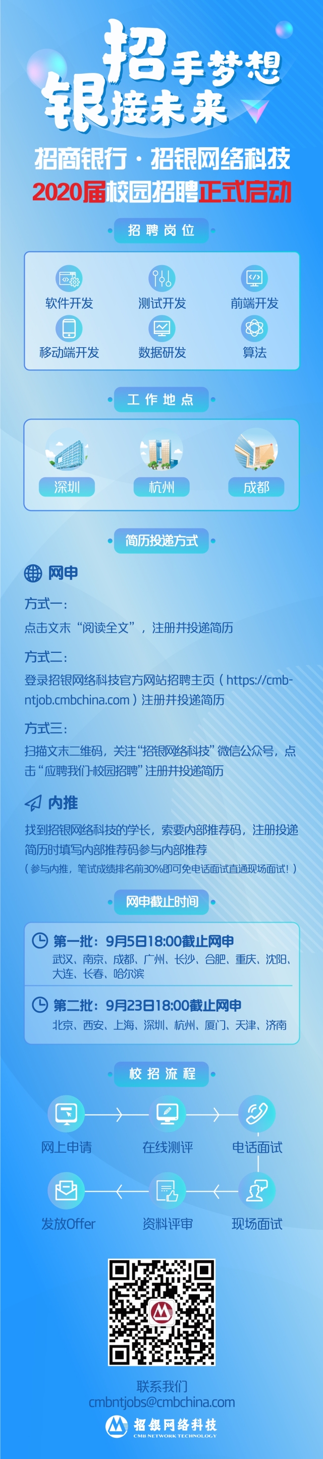 招商银行·招银网络科技提供软件开发、测试开发、前端开发、移动端开发、数据研发及算法等各个方向的职位,为2020届理工科类毕业生提供专业的发展平台,毕业生可以通过以下链接获取校招详情,进行注册简历:https://cmbntjob.cmbchina.com 。