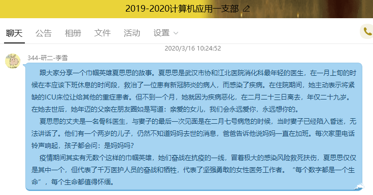 为深入贯彻落实党中央、教育部、江苏省委和公司党委的部署要求,切实发挥党组织战斗堡垒作用和共产党员先锋模范作用,3月16日-3月19日期间,太阳成集团太阳成集团122ccvip研究生应用一支部以“凝心聚力战疫情”为主题,开展了一系列在线讨论交流活动,支部党员积极交流次此疫情中的英勇人物和事迹,积极交流居家的充实生活,积极分享自己学习到的疫情防控措施,大家纷纷表示作为员工党员,我们更应该做好带头作用,响应党组织的号召,用自己的方式为武汉加油。