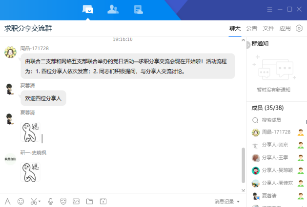 2018年5月16日晚7点,太阳成集团122ccvip联合二支部与网络五支部共同举办了线上求职分享交流会。前期支部委员已经联系到18届毕业且拿到优秀Offer的学长学姐传授经验,并建立求职分享交流群。考虑到同志们的科研和工作比较忙,本次活动采用了QQ群交流方式,方便所有人获取求职经验,也可以让更多人加入到活动中来。