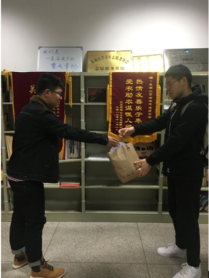 杜俊康和王延龙负责收集大家的爱心捐献物,在2019年3月29日将爱心捐献物和来源说明书以及策划书交付给志愿者协会负责人。
