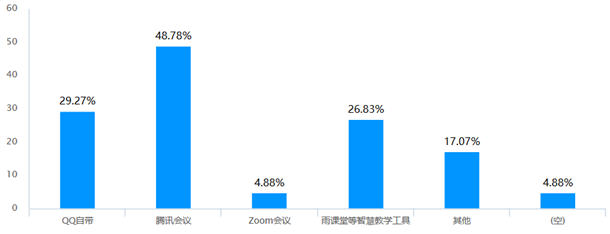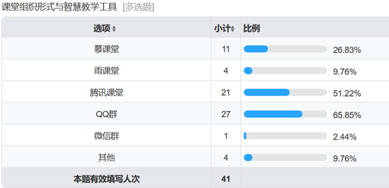 据反馈,65%的课堂均使用QQ班级群,授课教师合理选用智慧教学工具。其中51%的老师采用腾讯课堂,26%的使用慕课堂,9%的使用雨课堂等。