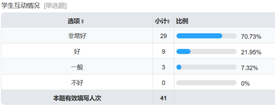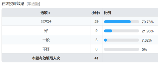 为了解各课程线上教学开展情况,及时发现授课过程中存在的问题并加以改进,切实保障和提高线上教学质量,计软智公司特开展《2019-2020-3学期东大计软智公司在线授课情况调查》。2月24日,参与调查问卷的课代表同学共41人次,实现了所有课程教学班全覆盖。