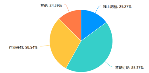 在线课堂上开展的交互活动,答疑讨论的占85%,布置作业的占58%,线上测验占29%。