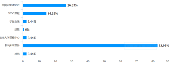 授课教师使用的线上教学资源,其中使用群内PPT课件的最多,约占83%;其次是中国大学MOOC,约占27%;SPOC课程资源,约占15%;学堂在线资源,约占2%。