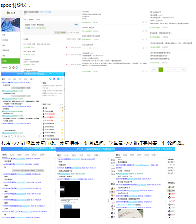 课程采用异步spoc、QQ语音电话&屏幕分享。异步spoc用来看mooc视频,讨论区提问讨论;QQ群投票签到,答疑和发公告。上课时段网络状况较好。对于共性的问题和难点采用QQ语音电话&屏幕分享。边讲解边提问,员工通过QQ群打字回答。讲解时老师开启话筒,全员静音。除了采用屏幕共享外还用了白板共享,用鼠标写字效果不好,缺手写板和电子笔。课后也不断地有员工私信答疑。(见下图)