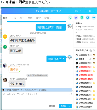 1、预案采用雨课堂网上平台布置课件、相关视频、作业和测试。实际任课教师常常不能登录使用其功能。从使用情况看,雨课堂网络平台经常出现网络卡堵,影响员工登录,还有雨课堂迟迟不能开通会员,所以无法在线语音等,所以第一次课签到移到QQ群打卡完成。(见下图)