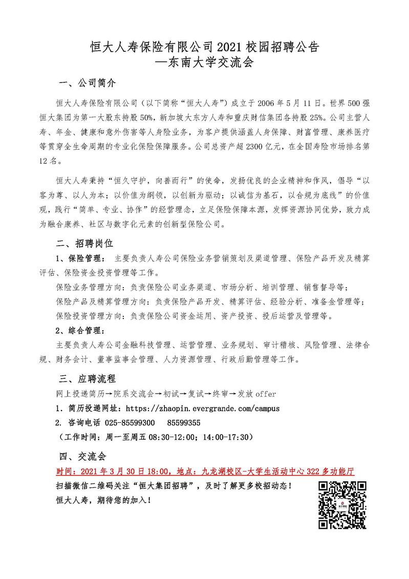 请有意向的同学们参加3月30日(周二)18:00在太阳成集团九龙湖校区老员工活动中心322多功能厅举办的宣讲会,同时扫描公告上的二维码进行简历投递,关注后进入校园招聘-简历投递-科技与保险-恒大人寿-选择岗位和地点进行投递。
