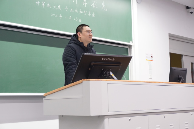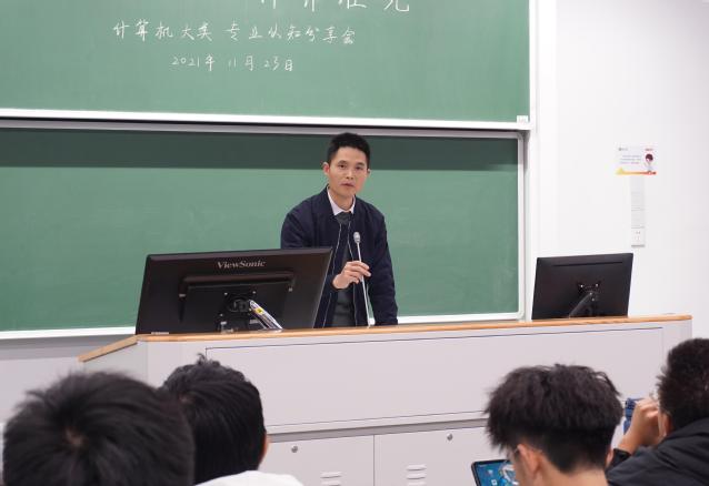 三位学长学姐代表的专业认知分享结束后,智能系统与应用方向的教师代表倪庆剑老师向大家分享了计算机类学习、科研和工程方面的建议。他首先进行了计算机类的相关介绍、大学学习任务与目标的明确;然后他从不同阶段的学习规划、进行科研与工程时的资料查询管理等方面对大一员工做出了详细具体的学习生涯指导。最后,他鼓励大家向公司的人才培养目标更进一步