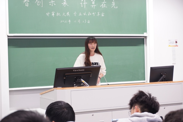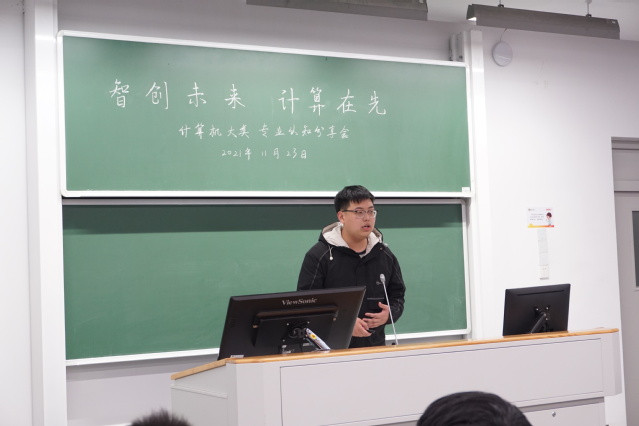 首先是计算机科学与技术专业的优秀学长代表殷春锁同学带来的专业认知分享他首先进行了专业总体介绍,总结了计算机科学与技术专业的专业特点与能力要求;接着他以公共必修课程为线索向大家分享了各门课程特点与基本学习方法;第三部分他进一步介绍了计算机科学与技术专业的主干课程与选修课程;最后,他向大家讲述了一些面对专业分流选择的个人感想,并对大一的学弟学妹们提出了建议与祝福。