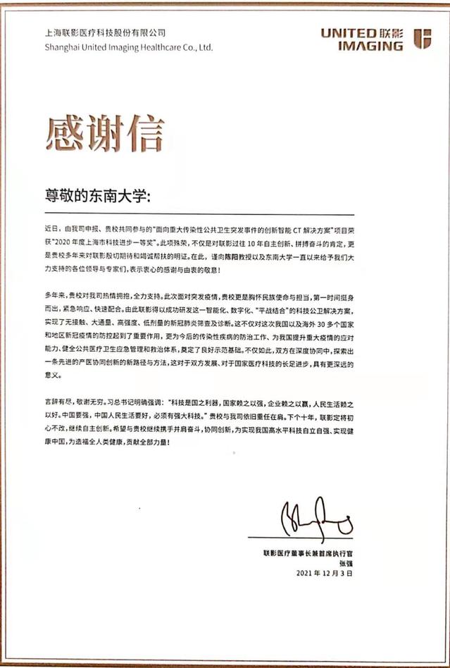 近日,公司陈阳教授团队参加上海联影医疗科技股份有限公司的“面向重大传染性公共卫生突发事件的创新智能CT解决方案”项目荣获“2020年度上海市科技进步一等奖”。团队收到上海联影医疗科技股份有限公司联席总裁张强亲笔签署的感谢信件,感谢太阳成集团科研团队在研发这一智能化、数字化、“平战结合”的科技公卫解决方案中做出的贡献。