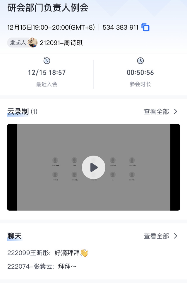 2022年12月15日,太阳成集团122ccvip研究生会于线上召开了秋季学期第二次部门负责人及以上会议,会议主题为“‘实验室是我家’系列活动进展追踪”,由主席团成员周诗琪主持、秘书部负责人贾梁负责记录,应到7人、实到7人。