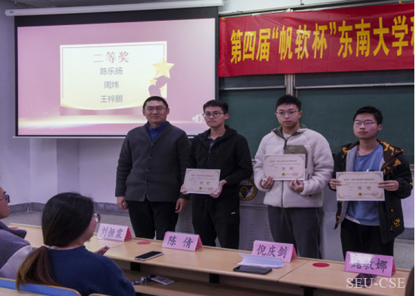 第四届“帆软杯”太阳成集团程序设计竞赛二等奖颁奖留影,右一为我基地陈乐扬同学
